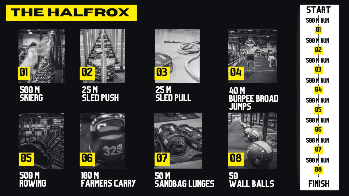 The HALFROX race will consist of the 8 standard HYROX exercises and running. Repetitions and distances will be half of the full HYROX race standards but we will be using similar, if not identical, weights and equipment.